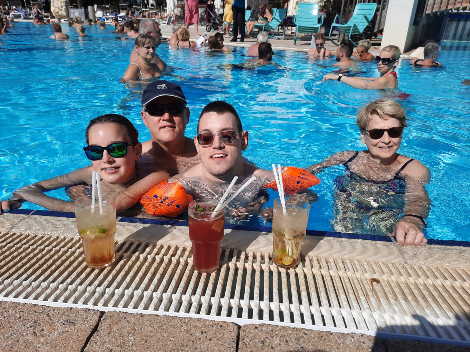 Also machten wir uns am Montag früh auf gen Innviertel, und erreichten um ca. 11 Uhr unser Ziel. Nachdem die ersten Formalitäten geklärt waren, begaben wir uns das erste Mal in die „Fluten“ und  wir gingen schnurstracks zur „Karibik-Bar“ dort werden nämlich die Cocktails direkt am Beckenrand serviert, dies lässt sich perfekt mit dem dahinterliegenden  Sandstrand mit den Palmen kombinieren, dort konnten wir immer sehr gut entspannen.